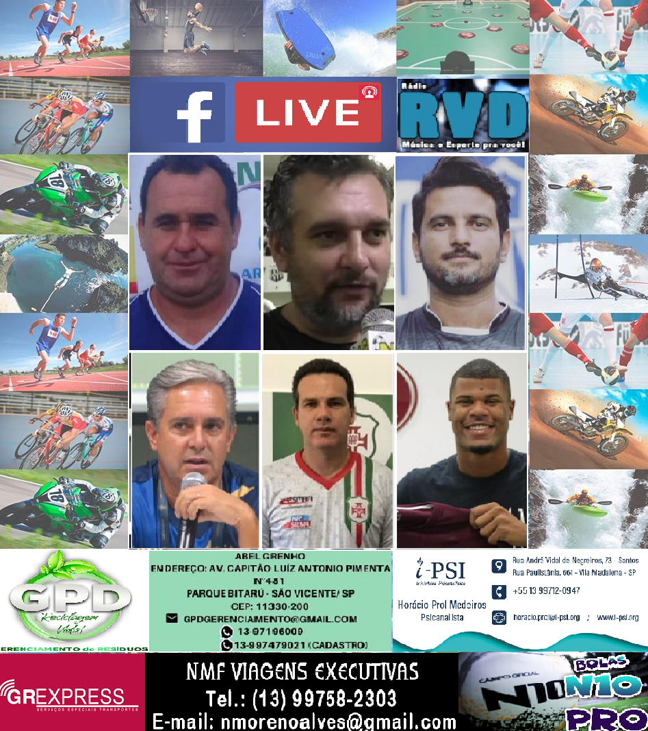 Nesta sexta-feira, dia 19, a partir das 19h50, tem o BBB - BATE BOLA BRASIL - na página da RÁDIO RVD no face. Bate papo com o ex-jogador Esquerdinha; Elder Campos, treinador da Portuguesa Santista; Fabão, zagueiro da Ferroviária(SP); Juarez Sobreiro Leite, coordenador técnico e treinador do time sub 17 do Brasilis(SP); Luiz Antônio Ribeiro Alves Jr, Coordenador Geral das categorias de base e gerente de futebol profissional do Cruzeiro(RS), Walter, preparador de goleiros, além do jornalista Guto Brito( E GUTTO NELLES). Contamos com a sua audiência.