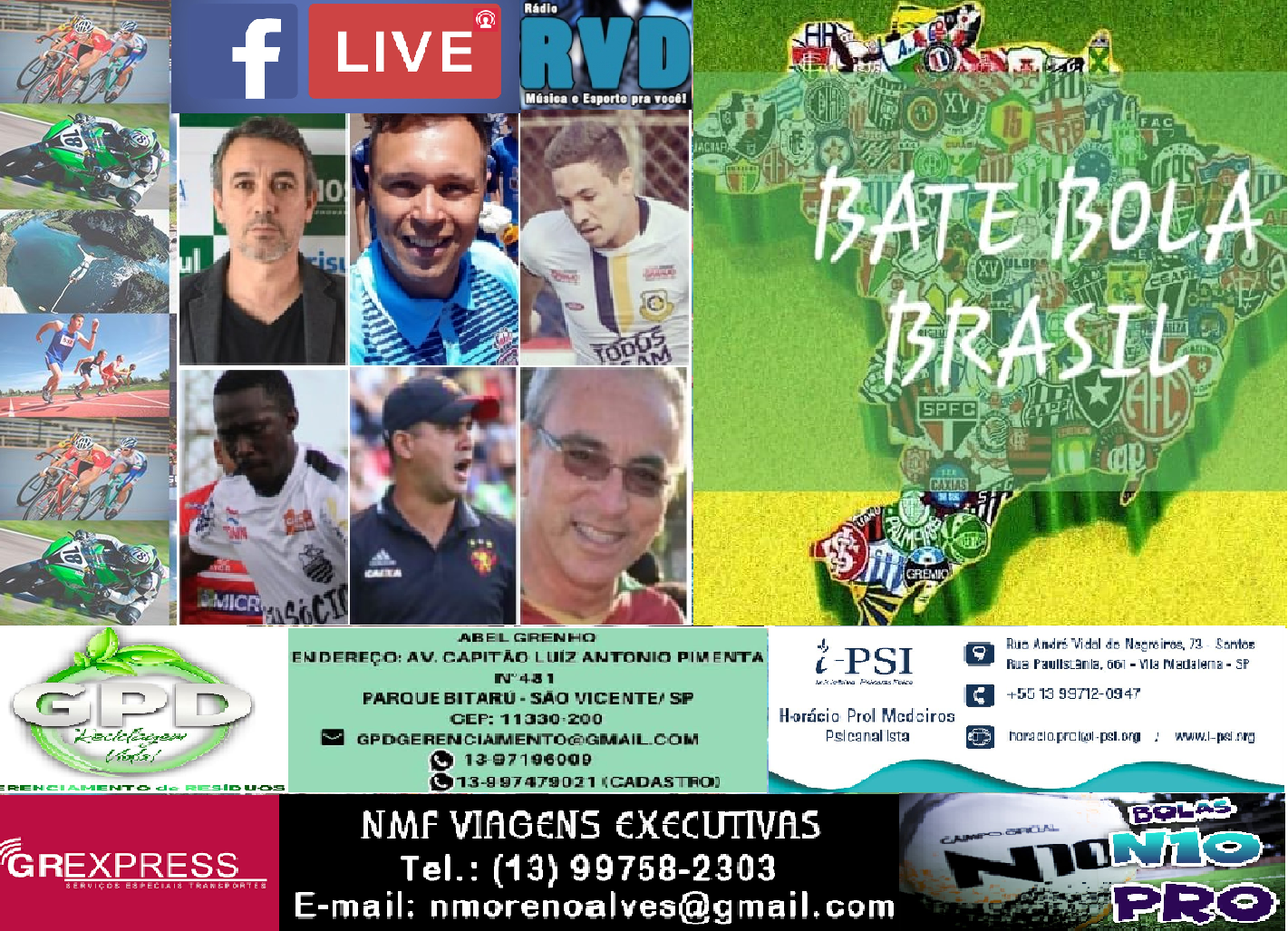 Nesta sexta-feira, dia 3, a partir das 19h50, na página da RÁDIO RVD no face tem o BBB - BATE BOLA BRASIL. O bate papo será com Sued Clayton, treinador sub 17 do Sport Recife; Marcos Martiniano, Supervisor de Futebol; Fernando Jr, jogador do São Bernardo FC; Lucas Lino, jogador do Comercial, de Ribeirão Preto (SP); Luciano Boeira, treinador do Projeto Boeira Sports; Glênio Cordeiro, Gerente de Futebol do Sport Club Gaúcho, de Passo Fundo(RS), e participação especial de Paulo Jr, supervisor de futebol, Contamos com a sua audiência.