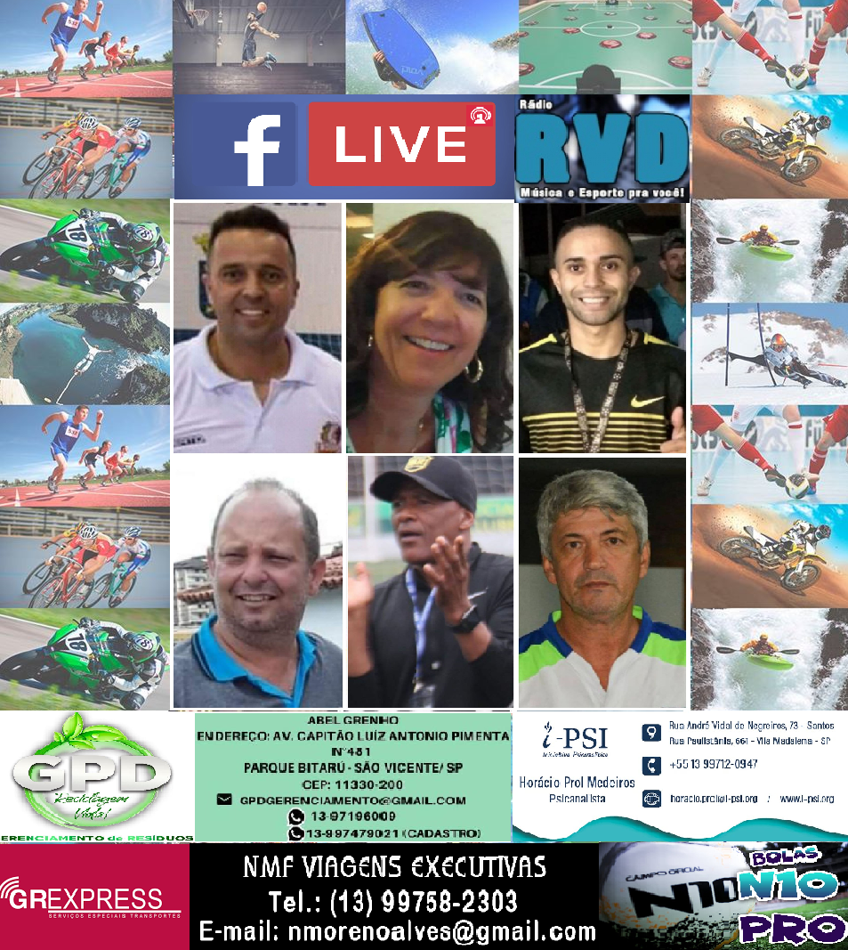 Nesta quarta-feira, dia 5, a partir das 19h50, tem ESPORTES LIVE na página da RÁDIO RVD no face. O bate papo será com Mara Alice, Diretora Regional de Esportes Unidade Ribeirão Preto; Wellington Lima, treinador do Albatroz Fut 7, de Bertioga(SP); Antônio Henrique Corsi, diretor de cultura, esportes e turismo de Monte Alegre do Sul(SP); Laguna, treinador do Caja FUT 7(PR); Armando Márcio Gomes, Presidente da Confederação Sul Brasileira de Fut 7; Clieton Luis, treinador do Tupã Basquete(Sub 14, 15 e 170. Contamos com a sua audiência.