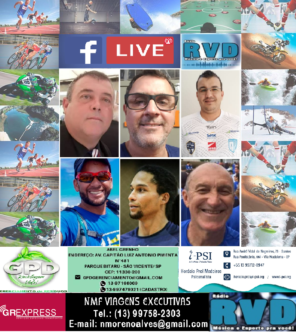 Nesta quarta-feira, dia 26, a partir das 19h50, tem ESPORTES LIVE na página da RÁDIO RVD no face. Bate papo com Mauricio Fernandes, do Tamboréu; Thiago Fernandes, Presidente do Real Brasilia Futsal; Alê Volpe, treinador do vôlei masculino de Araraquara(SP); Paulão, jogador de handebol do Ribeirão Preto/Barão de Mauá(SP); José Carlos de Souza, Secretário de Esportes de Praia Grande(SP); e Kleber Vieira Pinho, atleta de trekking piloto de parapente. Contamos com a sua audiência.