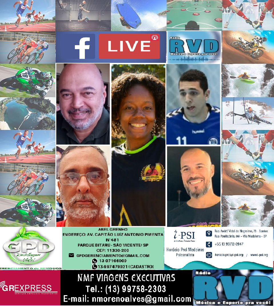 Nesta quarta-feira, dia 2, a partir das 19h50, tem ESPORTES LIVE na página da RÁDIO RVD no face. Bate papo com Gilvan Nogueira, técnico desportivo de Itapira(SP); Arthur Leandro, coordenador técnico do basquete de Avaré(SP); André Luis, gestor técnico da liga de basquete do Centro Oeste Paulista; Fabiana Mizael, técnica e coordenadora do Projeto Nova Geração Handebol de Ituiutaba(MG); e Gabriel Batera, jogador de handebol do EC Pinheiros(SP). Contamos com a sua audiência.
