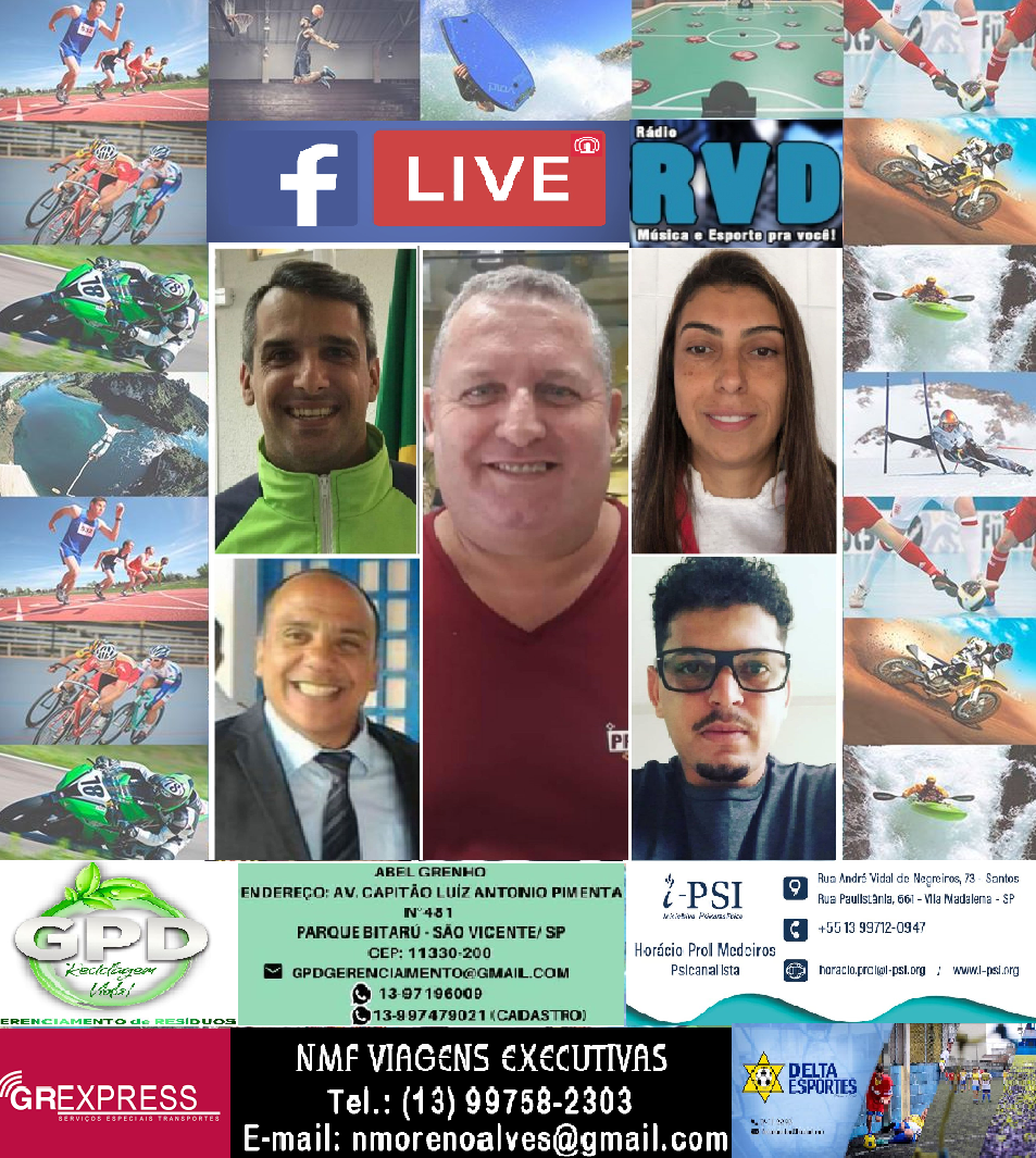 Nesta quarta-feira, dia 30, a partir das 19h50, tem ESPORTES LIVE na página da RÁDIO RVD no face. O bate papo será com Raoni Dolpi, Secretário de Esportes de Serra Negra(SP); Joel Pinho, Secretário de Esportes de Guaratinguetá(SP); Nilmara Alves, Assessora de Esportes de Aparecida do Norte(SP); Rogean Adoles, Secretário de Esportes e Lazer de Lavrinhas(SP); e Claudio Camarão, da Secretaruia de Esportes de Praia Grande(SP). Contamos com a sua audiência.