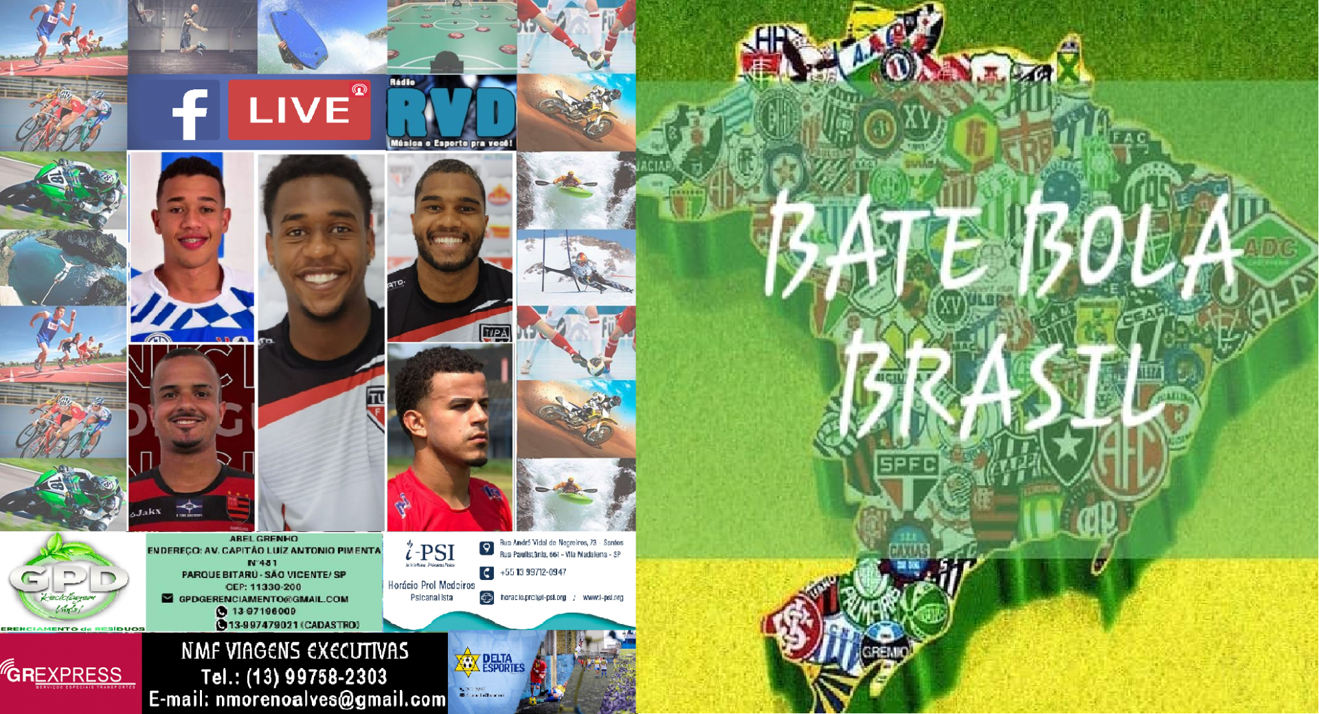 Nesta quinta-feira, dia 15, a partir das 19h50, teremos o BBB - BATE BOLA BRASIL - na página da RÁDIO RVD no face. Vamos bater uma bola com Matheus Moskito, jogador do Andradina EC; Vinicius Rodrigues, do Flamengo, do Guarulhos(SP); Dudu e Mateus Robinho, jogadores do Tupã FC, e Hugo, jogador do Jabaquara AC. Contamos com a sua audiência.