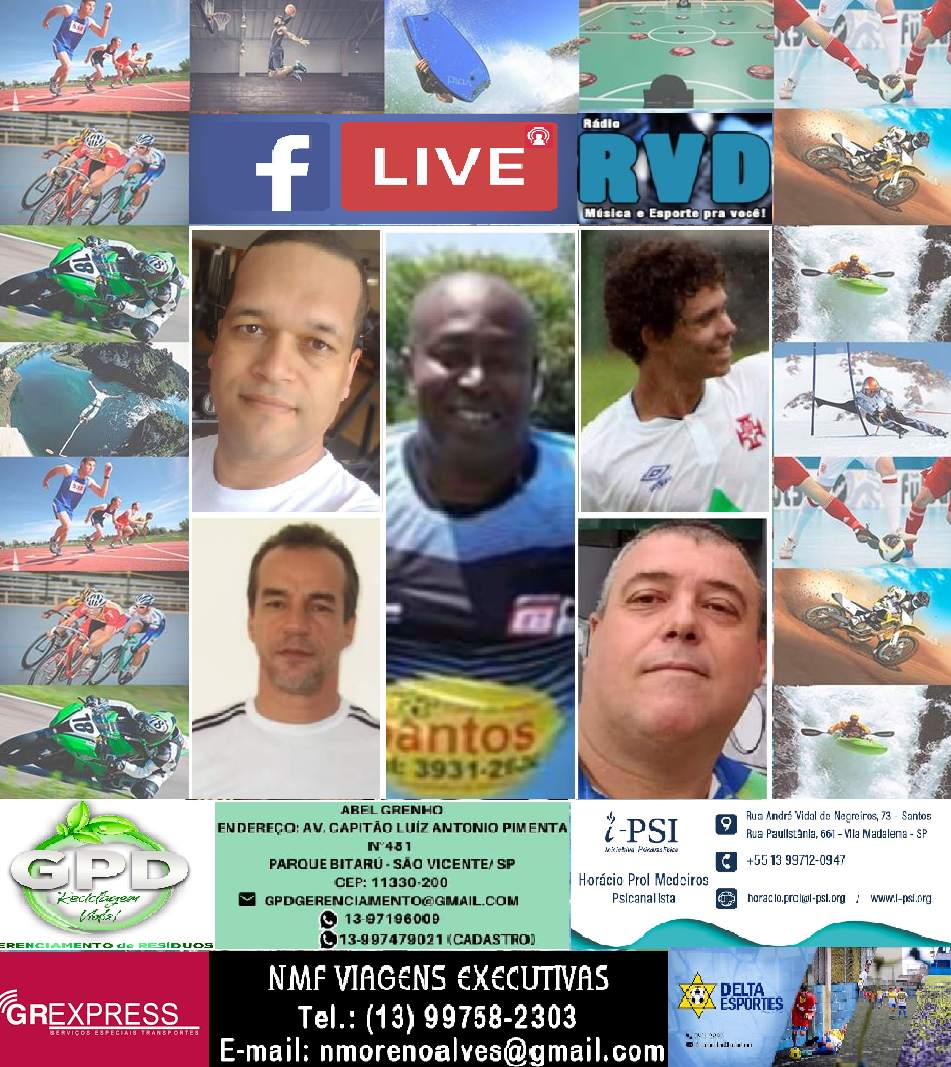 Nesta quinta-feira, dia 5, tem ESPORTES LIVE a partir das 19h50 na página da RÁDIO RVD no face. Bate papo com Eric de Paula, Técnico de handebol de Mogi das Cruzes(SP); Celso Bré, ex-jogador e hoje árbitro de futebol; Chico, do Vôlei de São Vicente(SP); Gustavo Diniz, jogador sub 20 da Portuguesa Santista; e Mauricio Fernandes, coordenador do Projeto Tamboréu na AA Portuários, em Santos-SP. Contamos com a sua audiência.