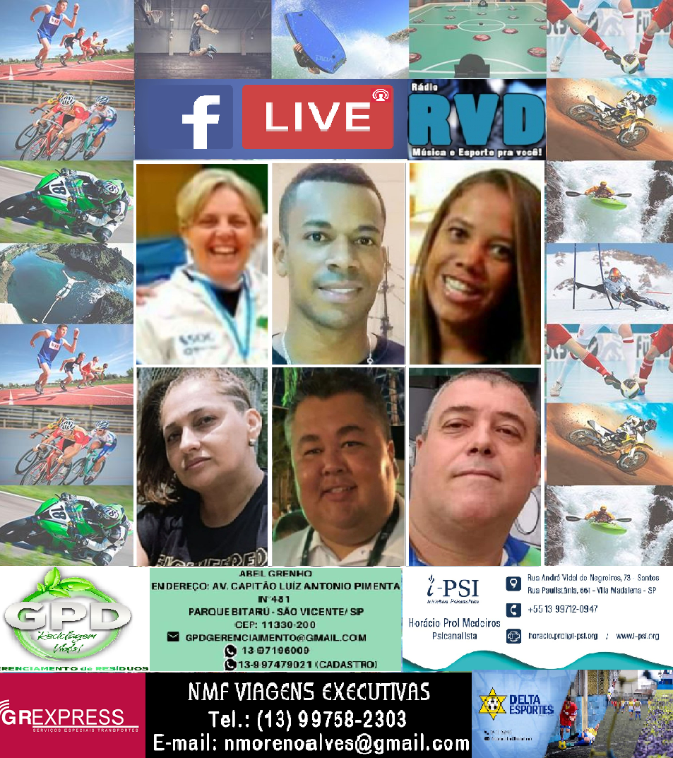Nesta quarta-feira, dia 11, a partir das 19h50 tem ESPORTES LIVE na página da RÁDIO RVD no face. O bate papo será com Carla Ribeiro, jogadora de Tamboréu; André e Marah, do Projeto Base Bola, do Guarujá-SP; Sheila Correa, idealizadora do Projeto Cohab Basquete; Anderson Shiga, técnico da ADEN - Associação das Equipes de Natação - de Mogi das Cruzes(SP), e Mauricio Fernandes, Projeto de Tamboreu da AA Portuários, em Santos-SP. Contamos com a sua audiência.