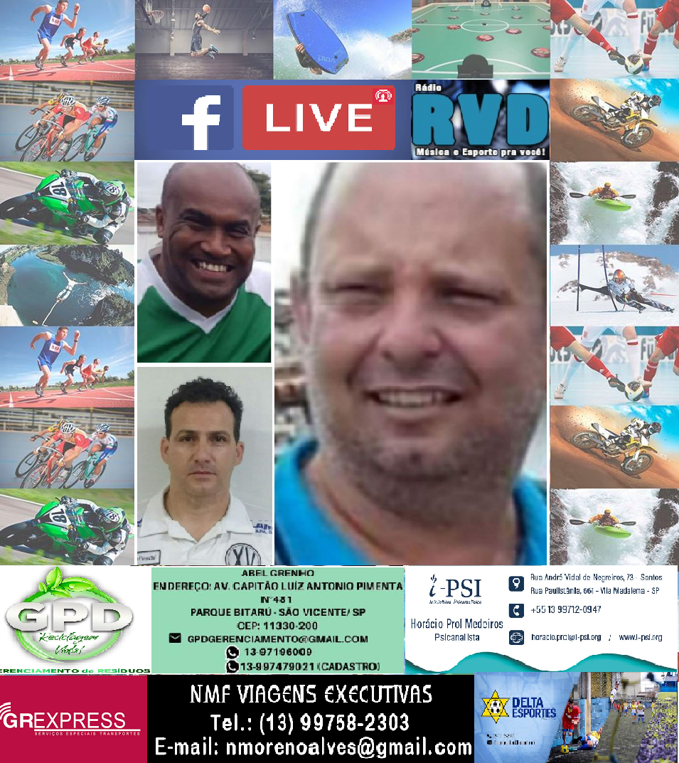 No ESPORTES LIVE desta terça-feira(17), a partir das 19h50, na página da RÁDIO RVD no face tem bate papo com Ailton, Presidente do EC Rezende e treinador/coordenador do futsal feminino do XV de Piracicaba; Rodrigo Negreti, ex-jogador e coordenador do PROJETO EC Indaiá, de Caraguatatuba-SP, e Antônio Henrique Corsi, o Toninho, Secretário de Cultura, Turismo e Esportes de Monte Alegre do Sul-SP. Contamos com a sua audiência.
