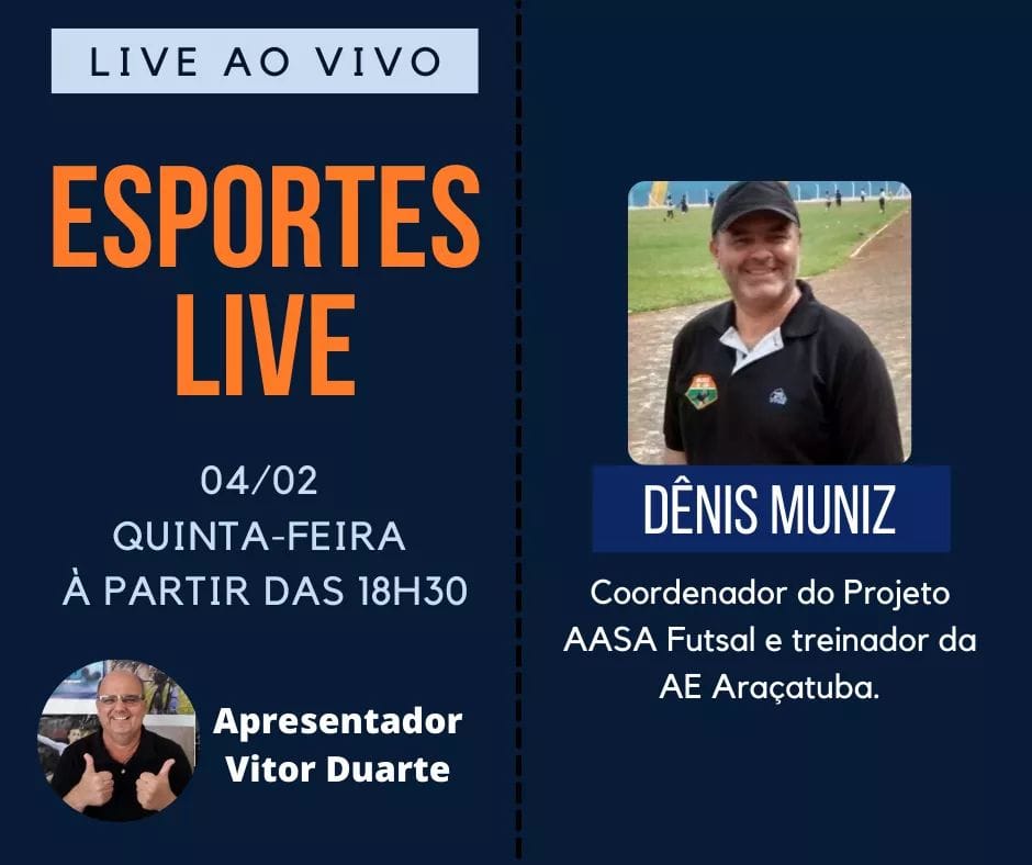 Bom dia galera ligada no Facebook, beleza? Mais um dia de Esportes Live para vocês. E hoje com a participação do Dênis Muniz, coordenador do Projeto AASA Futsal, e treinador da AE Araçatuba, direto do Ginásio do Educandário Santista, em Santos SP.