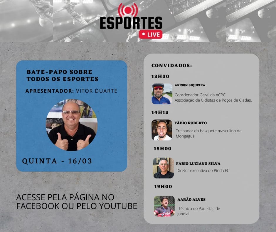 Nesta quinta-feira, dia 14, a partir das 13h30, tem ESPORTES LIVE na página da RÁDIO RVD no face e pelo Canal da RÁDIO RVD WEB no You Tube.