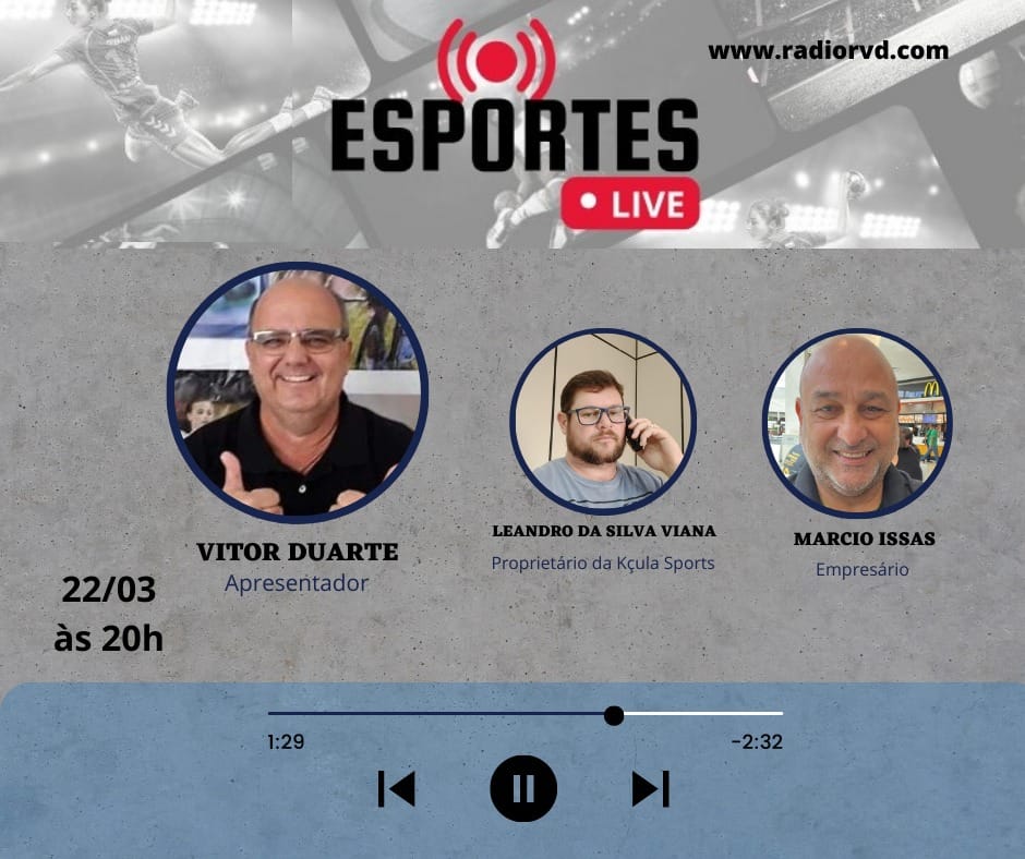 Márcio Issas, Dir. Esportes do Monte Libano, e Leandro Alves, diretor da Kçula Sports, nesta quarta feira no ESPORTES LIVE na RÁDIO RVD