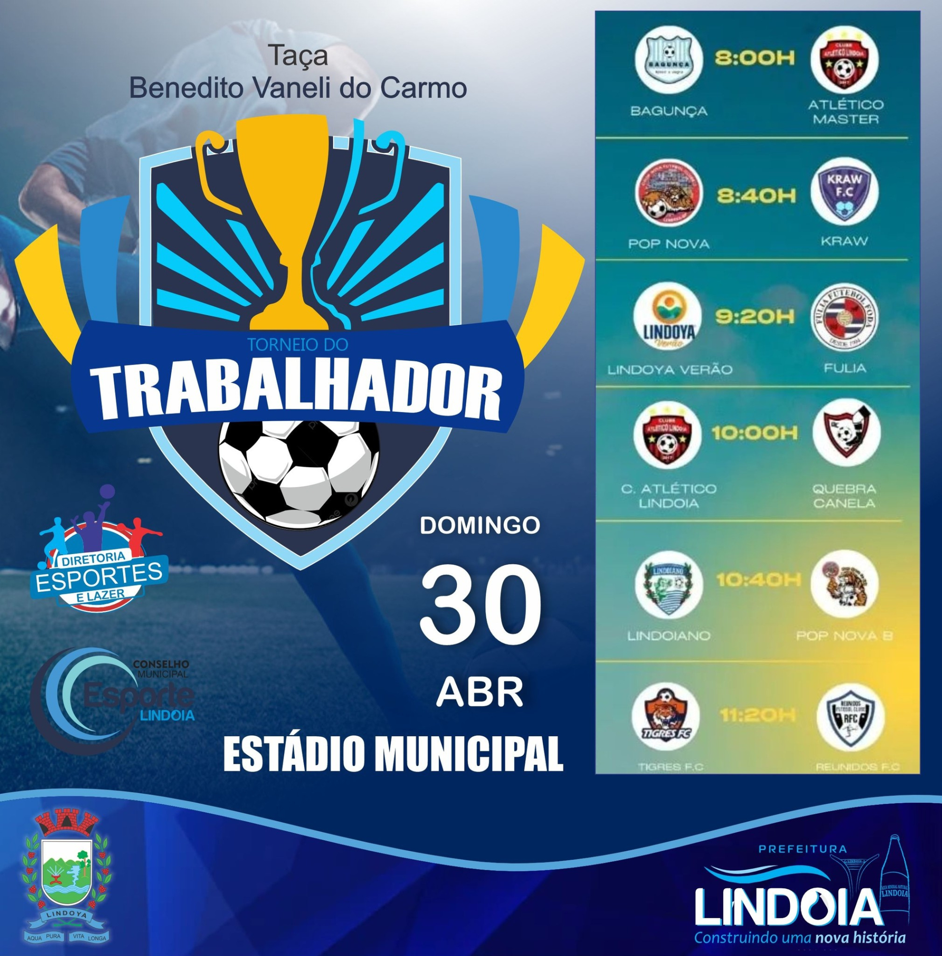 O departamento de esportes da cidade de Lindoia realizará neste domingo, dia 30, a partir das 8 horas, no Estádio Municipal de Lindoia(SP), o 42º Torneio do Trabalhador de Futebol no Estádio Municipal. O torneio, que já é tradicional, leva o nome de Benedito Vaneli do Carmo – “Ditão da Fonte”, esportista lindoiano nascido em 1939 e falecido recentemente, um batalhador onde atuou como jogador, técnico, colaborador e incentivador do nosso futebol amador, e também de José Edson Torteli Bernardi, nascido em 1961, Edinho, como é mais conhecido, foi um expoente jogador de futebol profissional de todo o Estado de São Paulo, atuando por diversas equipes como, Guarani, Atlético Amparo, Barretos, Novorizontino, Lemense, União São João de Araras e encerrando a carreira no Itapira.