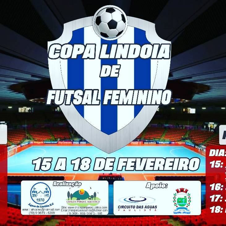 Será realizada no período de 15 à 18 de fevereiro na cidade de Lindóia-SP, a Copa Lindóia de Futsal Feminino. As vagas são limitadas. A realização é do ALEC(Águas de Lindóia EC) e Chalés Parque Aquático com apoio do Circuito das Águas Paulistas e Prefeitura de Lindóia. Mais informações com Toninho no whats: 19 - 99619-6309.