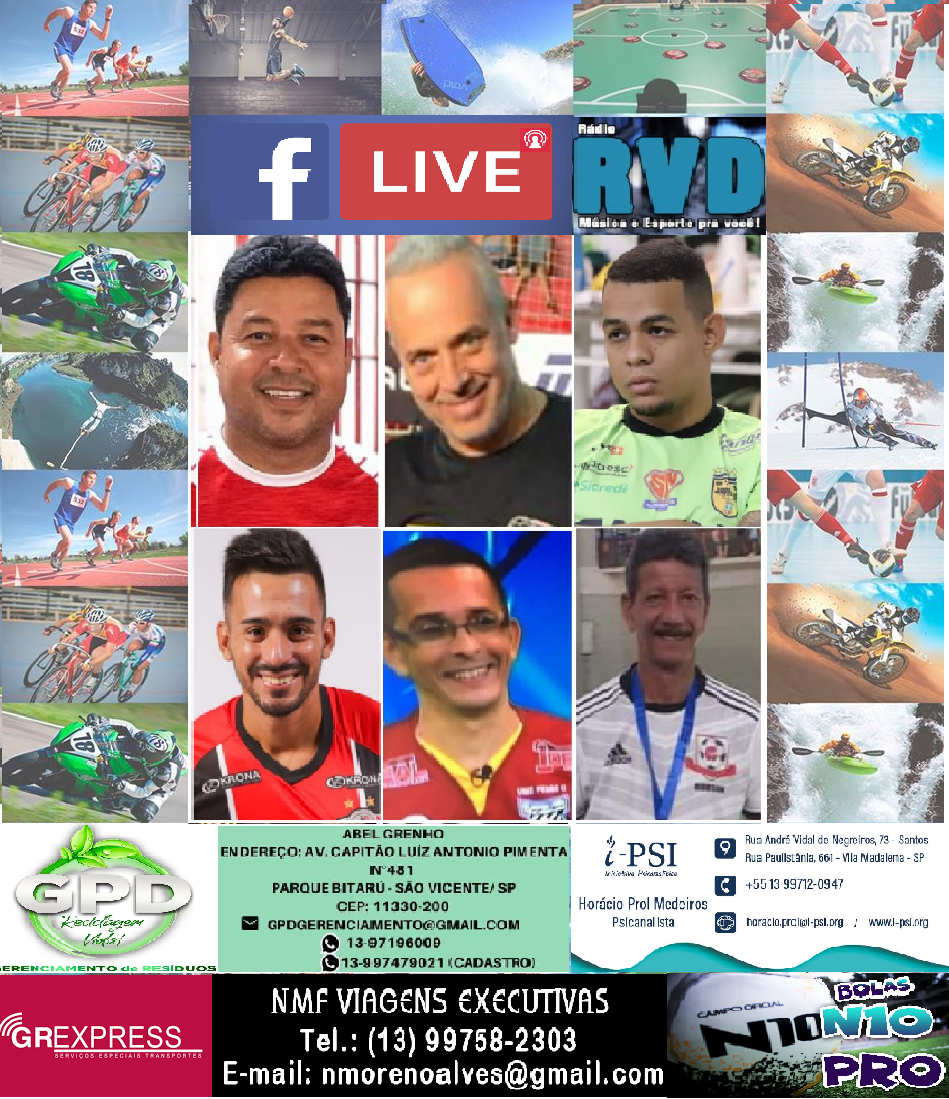 Nesta terça-feira, dia 23, a partir das 19h50, tem ESPORTES LIVE FUTSAL na página da RÁDIO RVD no face. O bate papo será com Renatinho, jogador do Joinvile(SC); Ygor Mota, jogador do Jaragua Futsal(SC); Pelé Branco, ex-jogador de futsal e hoje diretor da FPFS; Ivison Baixinho, coordenador e treinador de futsal do Náutico(PE); Ricardo Jardelino, treinador do Luiza Futsal, e Robson Prudêncio, treinador do Guarucar Futsal. Contamos com a sua audiência.