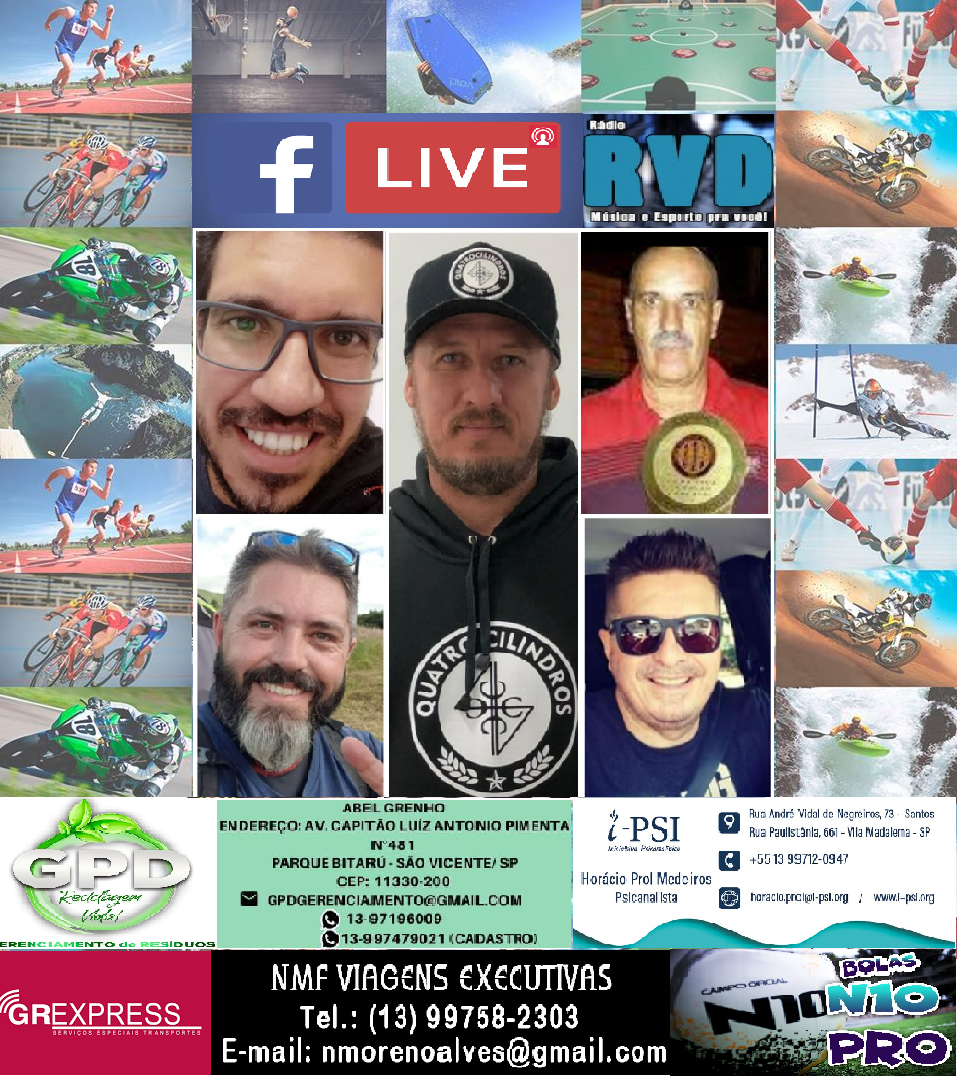 Nesta quarta-feira, dia 15, a partir das 19h50, na página da RÁDIO RVD no face tem o programa ESPORTES LIVE com Ricardo Barros, Diretor de Esportes de Peruíbe(SP); Ricardo Quiesse, jornalista e youtuber( Canal Falando de Parapente); Roberto Costa,ex-goleiro do Vasco e Atlético PR, hoje Chefe Regional do Esporte em Foz do Iguaçu(PR), Luiz Antônio(Kri Kri), diretor de esportes do Guarujá(SP), e Paulo Bullara, Instrutor e técnico em oficina de manutenção de parapentes. Contamos com a sua audiência.