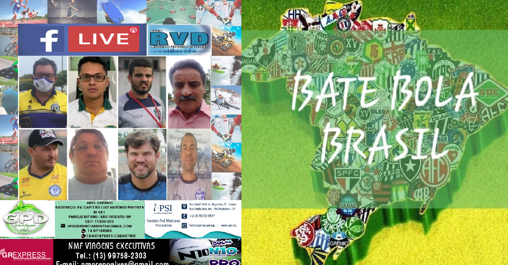 Nesta sexta-feira, dia 31, a partir das 19h50, tem BBB - BATE BOLA BRASIL - na página da RÁDIO RVD no face. O bate bola será com Murilo de Souza, Presidente da Associação de Treinadores de Base de Futebol e Futsal do Mato Grosso. Claudemar Ramos, coordenador do futebol de base Rondonópolis; João Marcos, Treinador do Aparecida(GO); Carlos Fernando Crispim, Diretor de Competições da Federação Catarinense de Futebol; Matheus Lima, treinador do Tapajós(PA); Ednei Fernandes, coordenador da base do Olimpia(SP); Pedro Henrique, treinador de futebol; e Omar Cury, Auxiliar técnico do Frei Paulistano(SE). Contamos com a sua audiência.