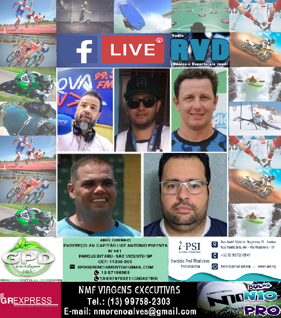 Nesta quinta-feira, dia 6, a partir das 19h50, tem ESPORTES LIVE na página da RÁDIO RVD no face. Bate papo com Marcelo Gotti(Gottinho), da Rádio Nova Onda FM 99,3(Mogi Guaçu-SP); Gonçalo Neto, Secretário de Esportes de Ilha Comprida(SP); Márcio Ambrust(Mago), treinador do time de Fut7 do Santos FC; Marcel, vice presidente do CFS Sindipetro Fut 7, de Caraguatatuba(SP); e Erick Lima, professor de handebol de Bertioga(SP). Contamos com a sua audiência.