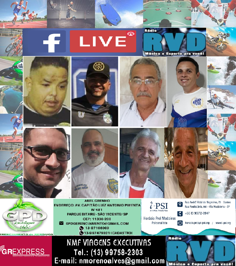 Nesta segunda-feira, dia 10, a partir das 19h50, na página da RÁDIO RVD no face tem SOU DA VÁRZEA, o verdadeiro futebol raiz. Bate papo com o professor José Laudier e as histórias da várzea; Pio, jogador do EC Jardim Casqueiro(Cubatão); Cesinha, diretor do Agulhão(Santos); César Eduardo, Diretor do Bertioga FC( Bertioga); Luis Carlos Hora, treinador do Guamium(São Vicente); André, do AR Metropolitano, de Praia Grande(SP); Felipe Bastos Jr, vice presidente do União Quietude Alvorada, de Praia Grande(SP), e o ex-jogador Roxo. Contamos com a sua audiência.