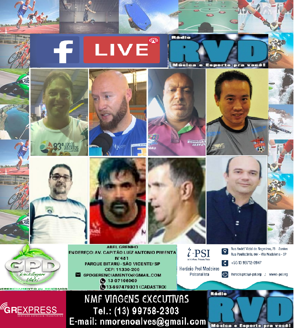 Nesta terça-feira, dia 18, a partir das 19h50, tem ESPORTES LIVE FUTSAL na página da RÁDIO RVD no face. Bate papo com Márcio, treinador e jogador do Atlético RP; Everton Carvalho(Alemão), treinador da FIB Bauru; Elias Ronei, treinador do Altinópolis Futsal; Dionisio Benante, Presidente da Liga de Futsal de Araçatuba; Aparecido Wagner(Jacaré), treinador Cravinhos Futsal; Massao Adati, treinador do Jahu Futsal; Daniel Sabino, treinador de futsal Marília; e Renê Tadeu , treinador da Uniara/ Araraquara(SP). Contamos com a sua audiência.