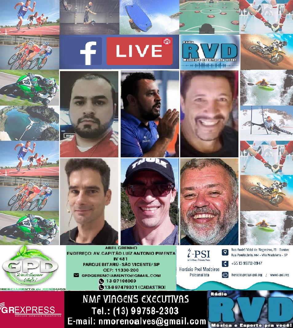 Nesta quinta-feira, dia 27, a partir das 19h50, na página da RÁDIO RVD no face tem bate papo com Marco Antônio Morais, treinador do Garca Basquete; Charlie Alves, Gestor em Turismo e montanhista; Cássio Luis Zamcopé, Secretário de Esportes de Garça(SP); Leonardo Ledo, Secretário de Esportes de Serrana(SP); Anderson Valério, técnico da Associação Desportiva de Telêmaco Borba(PR). e Marcelo Loiacono entrevista Ewerton Armani, diretor da Federação Paulista de Futebol de Mesa e atleta do Corinthians, e Alex Martins, Presidente da Liga União.