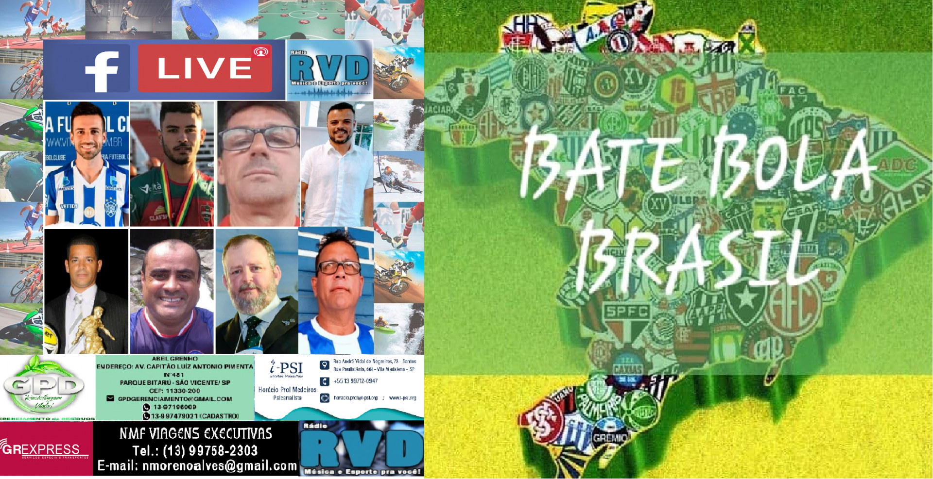 Sexta é dia de BBB - BATE BOLA BRASIL - na página da RÁDIO RVD no face. O bate bola terá as presenças de Léo Gonçalves, jogador do Vitória(ES); Júlio César, ex-goleiro; Carlos Seara, Presidente do Blumenau EC; Lelo, treinador do Jabaquara AC; Roberval Medeiros, gestor do Projeto AA Orleans(SC); Tuta, treinador do Porto(SC); Erick Batista, jogador de futebol; e Paulo Jr, Supervisor de Futebol. Contamos com a sua audiência.