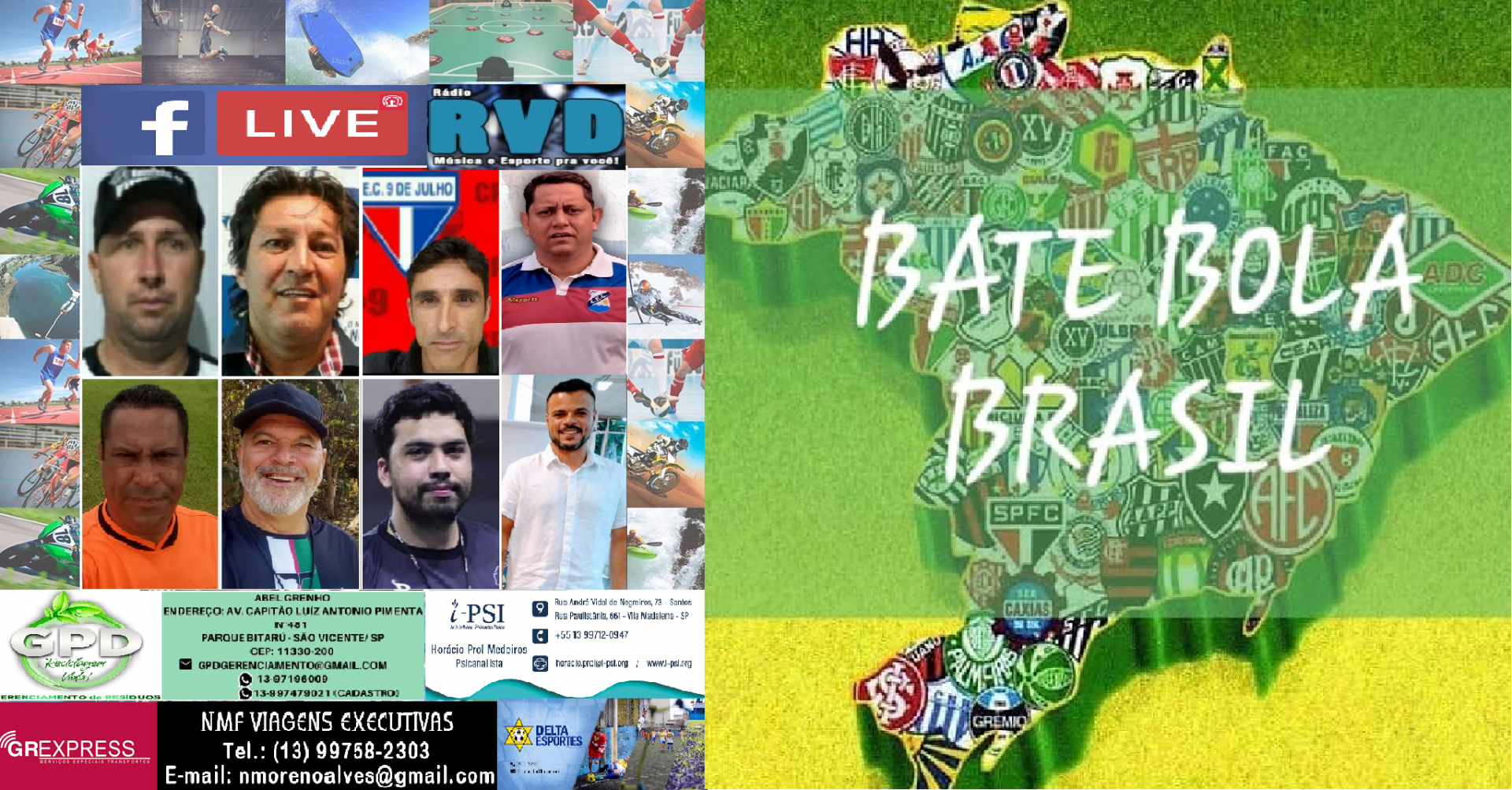 Sexta-feira, dia 11, é dia de BBB - BATE BOLA BRASIL - a partir das 19h50 na página da RÁDIO RVD no face. O bate bola será com o ex-goleiro Reinaldo; Yan Luis, supervisor de futebol do Rio Negro(AM); Ado, ex-jogador do Coritiba(PR); Luis Antônio,Presidente do 9 de Julho(PR); Celso Gomes, treinador de futebol de Perolândia(GO); Paulo Jr, Supervisor de Futebol e Higor Godoy, Presidente do Caldas EC(GO). Contamos com a sua audiência.