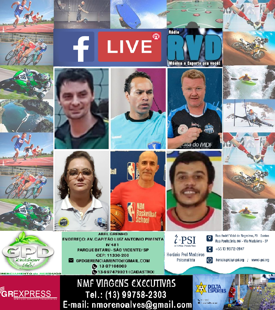 Nesta quinta-feira, dia 17, a partir das 19h50, na página da RÁDIO RVD no face tem ESPORTES LIVE com Rato, ex-jogador da Seleção Brasileira de Basquete e hoje treinador do time sub 19 de Guaira(SP); Diego de Lima, treinador de handebol de Mococa(SP); Solange Dalonso, coord, Estudantes Mirins, de Serra Negra(SP); Rui Gaino, treinador de vôlei do Circulo Millitar, de Campinas(SP); Joel Garcias, preparador de goleiros de futsal e ex-secretário de esportes de São Lourenço do Oeste(SC); Rogério Aparecido, árbitro internacional de handebol; e Sandra Marão, treinadora de vôlei de Matão(SP). Contamos com a sua audiência.