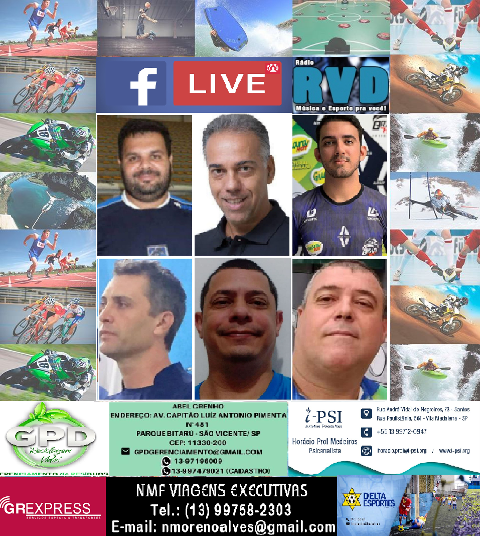 Nesta quinta-feira, dia 8, a partir das 19h50, tem ESPORTES LIVE na página da RÁDIO RVD no face, Bate papo com Alexandre Feijão, treinador da SE Barra Funda, do Guarujá-SP; Avelino Buorgemino, fisioterapeuta do Santos FC; Yuri Sampaio, Gestor e Supervisor do Vôlei Caldas Novas EC(GO), Willian Santos, treinador de basquete e da Liga Paulista; Xande, fundador do Projeto Cresce em Rio Claro(SP), e Mauricio Fernandes, professor e jogador de tamboréu. Contamos com a sua audiência.