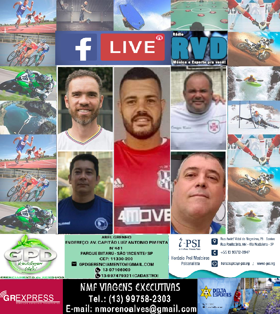Nesta quinta-feira, dia 22, a partir das 19h50, tem ESPORTES LIVE na página da RÁDIO RVD no face. O bate papo com Ernandes Carrocieri, ex-jogador e hoje treinador de futebol; Maycon, goleiro da Ponte Preta Fut 7; Celso Nevola(Celsinho), treinador sub13 da Portuguesa Santista; Emerson Konda, treinador da equipe de vôlei feminino de Santos; e Maurício Fernandes, jogador de Tamboréu. Contamos com a sua audiência.