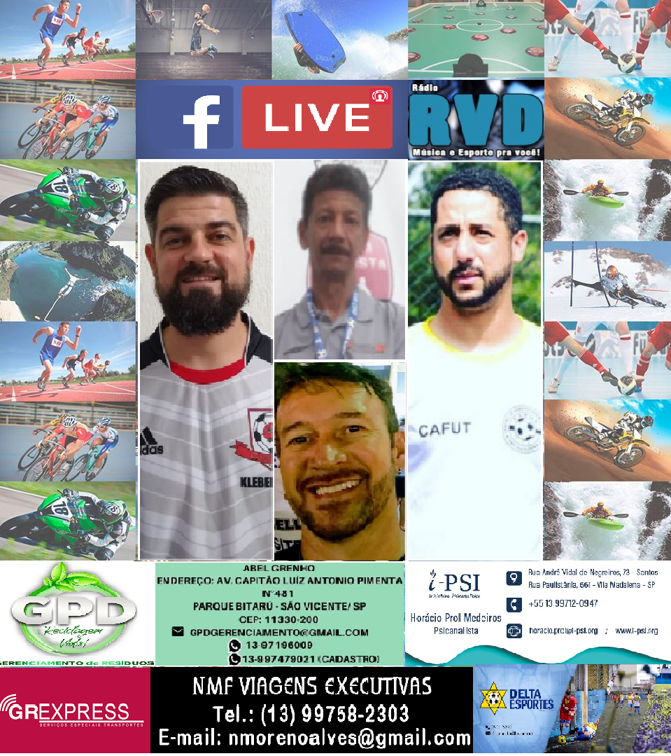 Hoje, terça-feira, dia 27, a partir das 19h50 tem ESPORTES LIVE FUTSAL na página da RÁDIO RVD no face, Bate papo com Robson Prudêncio, treinador do Guarucar/André Car; Pro Pirani, treinador da equipe sub 10 Luso Brasileiro/Guarucar; Marquinhos Silva, treinador da equipe principal do N10, de Jundiaí(SP); e Alessandro Pavanetti, treinador e coordenador da equipe de futsal feminino de Taubaté. Contamos com a sua audiência.
