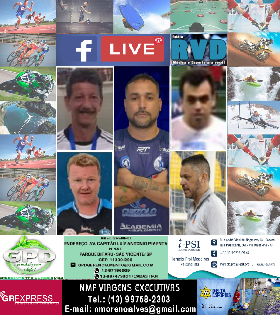 Hoje, terça-feira, a partir das 19h50, tem ESPORTES LIVE FUTSAL na página da RÁDIO RVD no face. O bate bola será com Fabiano Lourenço, treinador das equipes sub 20 e principal de futsal feminino da Associação São Carlense, de São Carlos-SP; Jair Garcias, preparador de goleiros da equipe de futsal masculino do São Lourenço(SC); Robson Prudêncio. treinador do Guarucar Futsal; Antônio Carlos, treinador da equipe de futsal femininp do Guarujá/Familia 1912; e Alan Victor, Presidente do Taubaté Futsal. Contamos com a sua audiência.
