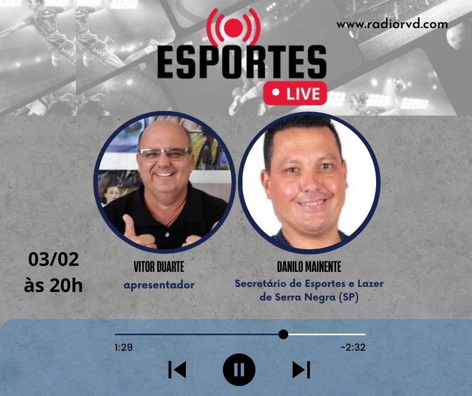 Nesta sexta-feira, dia 3, a partir das 20 horas, na RÁDIO RVD tem ESPORTES LIVE com Danilo Mainente, Secretário de Esportes e Lazer de Serra Negra(SP)