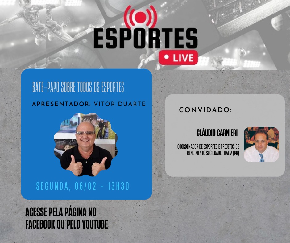 Nesta segunda-feira, dia 6, 13h30, tem ESPORTES LIVE na página da RÁDIO RVD no face e no Canal da RÁDIO RVD WEB no You Tube. O bate papo será com Cláudio Carnieri, Coordenador de Esportes e Projetos de Rendimento Sociedade Thalia - Curitiba/PR.