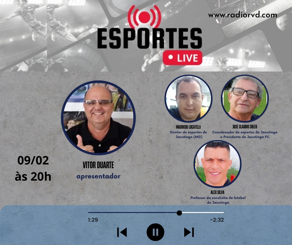 Nesta quinta-feira, dia 9, 20 horas, na RÁDIO RVD tem ESPORTES LIVE com a galera do esporte de Jacutinga(MG)