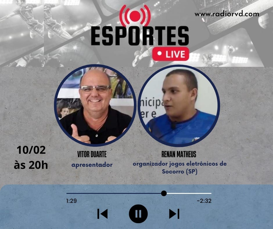 Nesta sexta-feira, dia 10, 20 horas, na RÁDIO RVD tem ESPORTES LIVE com a Renan Matheus, organizador Jogos Eletrônicos de Socorro( SP).