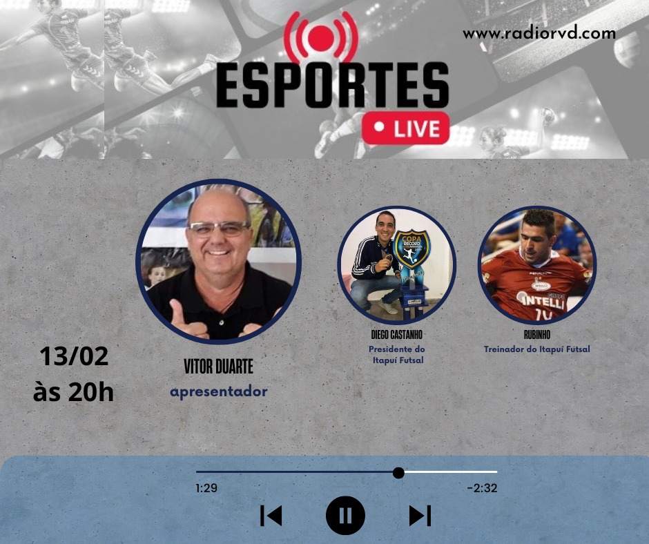 Nesta segunda-feira, dia 13, a partir das 20 horas, na RÁDIO RVD tem ESPORTES LIVE com Diego Castanho, Presidente do Itapui Futsal(SP) e Rubinho Claro, treinador.