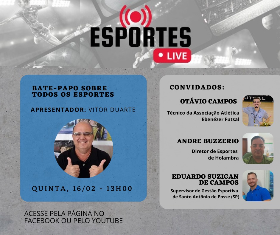 Nesta quinta-feira, dia 16, a partir das 13 horas, tem ESPORTES LIVE na página da RÁDIO RVD no face e pelo Canal da RÁDIO RVD WEB no You Tube. Convidados Otávio Campos, técnico da AA Ebenezer Futsal, de Frutal(SP); André Buzzeiro, Diretor de Esportes de Holambra(SP) e Eduardo Suzigan, Diretor de Esportes de Santo Antônio de Posse(SP).