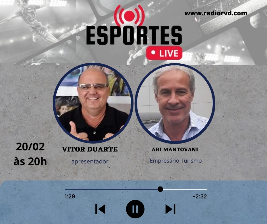 Nesta segundona, dia 20, a partir das 20 horas, na RÁDIO RVD tem ESPORTES LIVE com o empresário Ari Matovani.