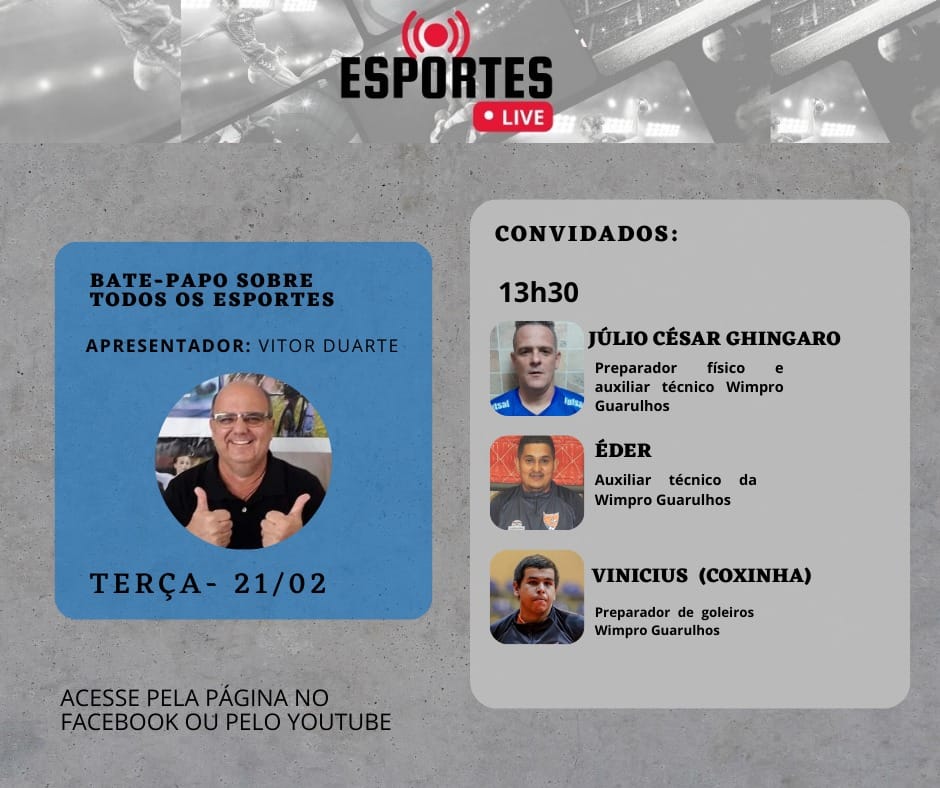 Nesta terça feira, dia 21, 13h30 tem ESPORTES LIVE na página da RÁDIO RVD no face e pelo Canal da RÁDIO RVD WEB no You Tube. O bate bola será com a comissão técnica da Wimpro Futsal, de Guarulhos(SP)