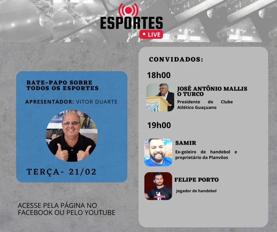 Nesta terça feira, dia 21, a partir das 18 horas tem ESPORTES LIVE na página da RÁDIO RVD no face e pelo Canal da RÁDIO RVD WEB no You Tube. O primeiro bate papo será com o Turco, Presidente do Guaçuano(SP), e na sequência teremos Samir e Felipe Porto, falando sobre handebol.