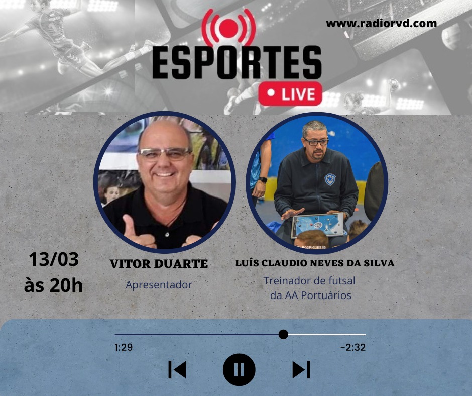 Nesta segunda-feira, dia 13, a partir das 20 horas, na RÁDIO RVD tem ESPORTES LIVE com Luiz Claudio(Luisinho), treinador de futsal da AA Portuários, de Santos-SP.