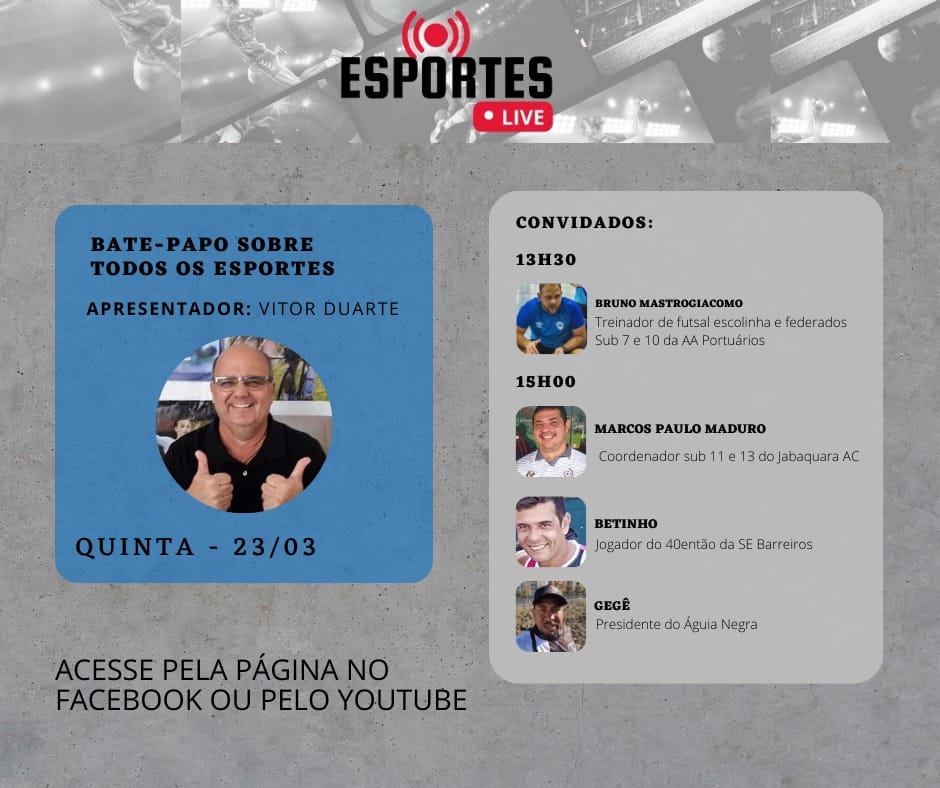 Nesta quinta feira, dia 23, a partir das 13h30, tem ESPORTES LIVE na página da RÁDIO RVD e pelo Canal da RÁDIO RVD WEB no You Tube.