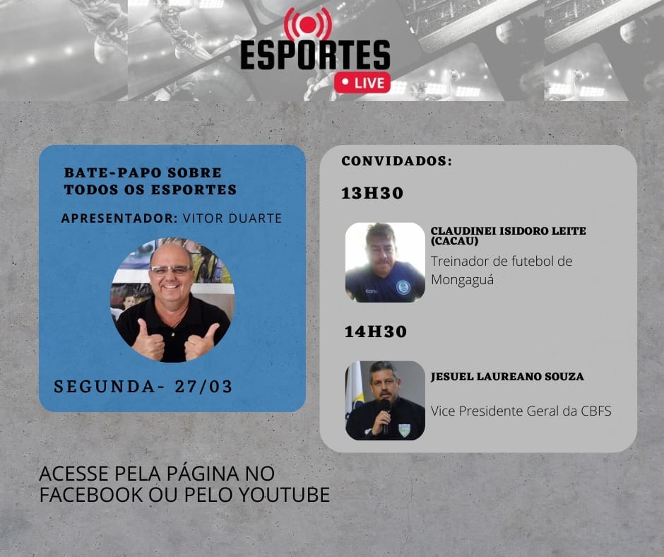 Nesta segunda feira, dia 27, a partir das 13h30, tem ESPORTES LIVE na página da RÁDIO RVD no face e pelo Canal da RÁDIO RVD WEB no You Tube. O primeiro bate papo é com Cacau, treinador de futebol de Mongaguá(SP), e na sequência tem Jesuel Laureano, Vice Presidente da CBFS.
