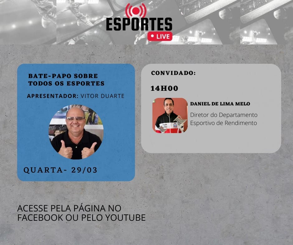 Nesta quarta feira, dia 29, a partir das 14 horas, tem ESPORTES LIVE na página da RÁDIO RVD no face e Canal da RÁDIO RVD WEB no You Tube. O bate papo será com Daniel Melo, Diretor do Departamento Esportivo de Rendimento de Praia Grande(SP).
