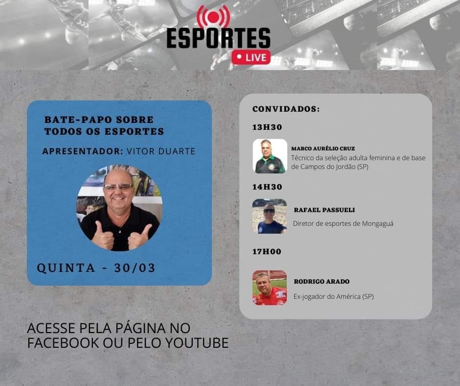 Nesta quinta feira, dia 30, a partir das 13h30, tem ESPORTES LIVE na página da RÁDIO RVD no face e pelo Canal da RÁDIO RVD no You Tube. Bate papo com Marco Aurélio, treinador das equipes de futsal feminino de Campos do Jordão(SP); Rafael Passueli, Diretor de Esportes de Mongaguá(SP), além de Rodrigo Prada, do Futebol Master do América(SP).