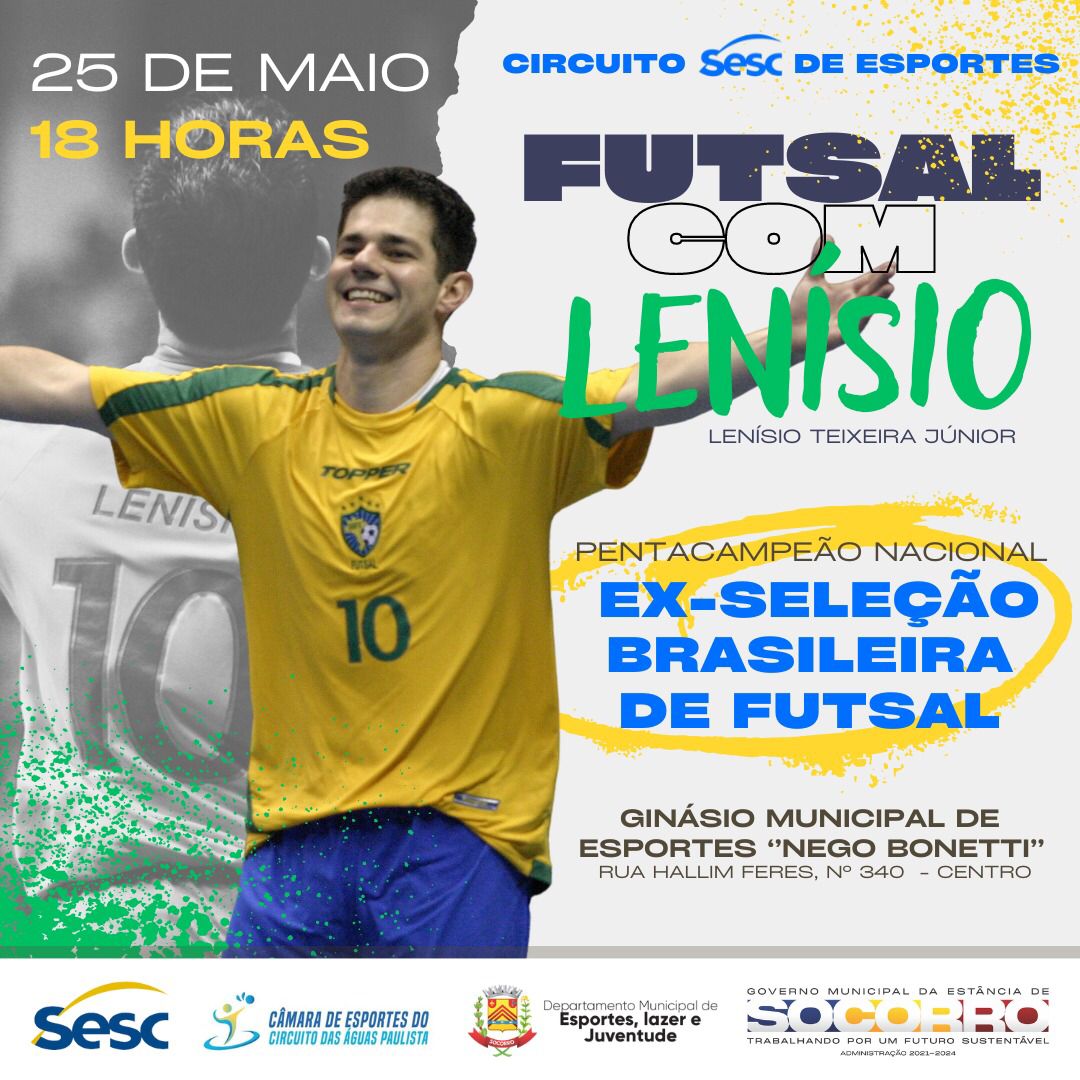 Com intuito de fomentar o esporte, o Sesc, em parceria com o Departamento de Esportes, Lazer e Juventude da Prefeitura de Socorro e Circuito das Águas Paulista, vai promover um encontro especial com Lenísio Teixeira Jr, ex-jogador profissional de futsal, pentacampeão nacional e segundo melhor do mundo. O evento acontecerá no dia 25 de maio, a partir das 18 horas, no Ginásio Municipal de Esportes “Nego Bonetti”, na cidade de Socorro(SP). A entrada será gratuita a população.