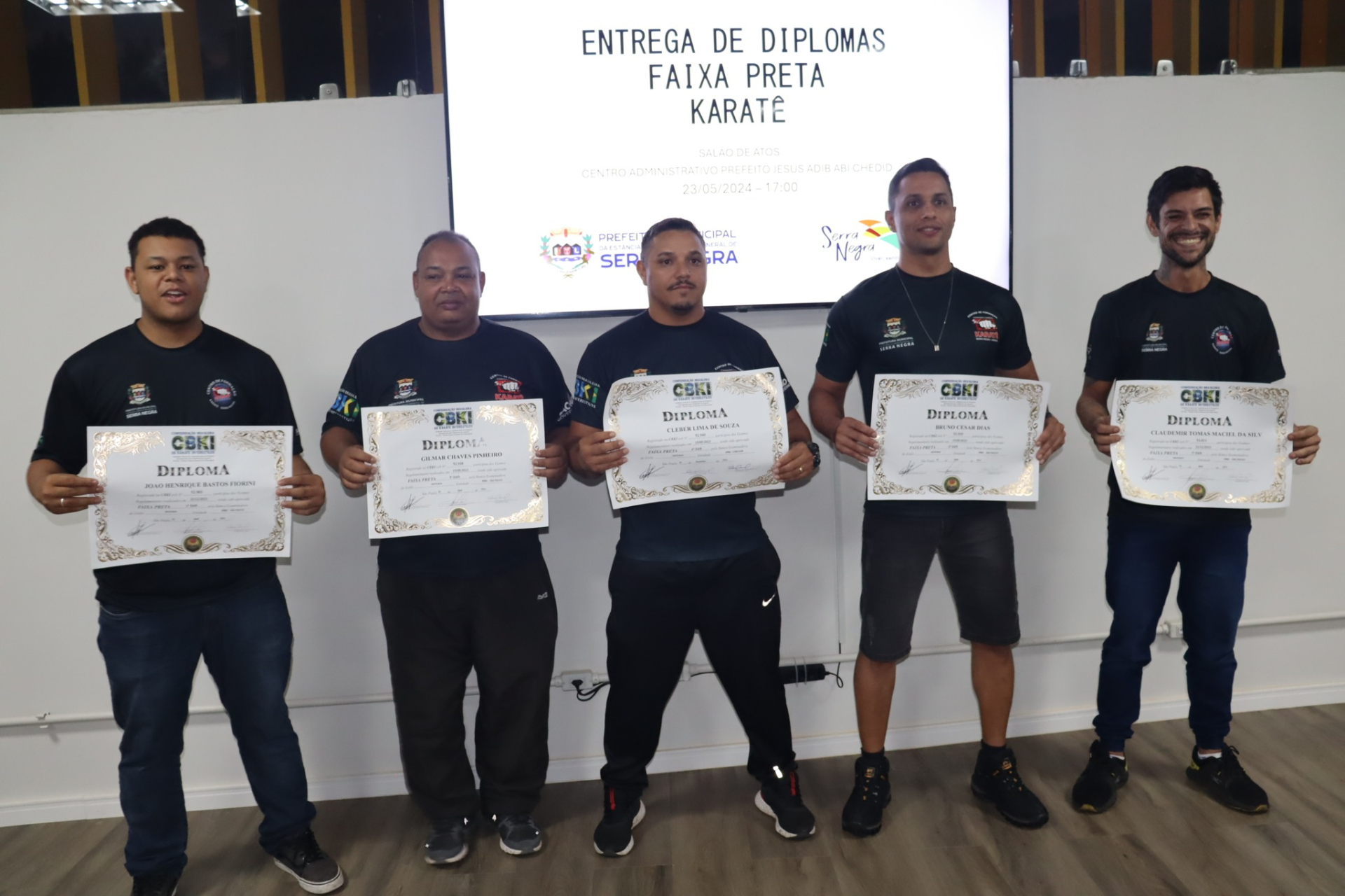 Dez caratecas de Serra Negra(SP) receberam o diploma de graduação com faixas pretas de diferentes níveis (DAN) da Confederação Brasileira de Karatê Interestilos (CBKI). Claudemir Tomas Maciel da Silva, João Henrique Bastos Fiorine, Lourena Ap. Machado Godoi, Luiz Roberto Tonhole Filho, Adriana Moreira Lima, Beatriz de Oliveira dos Santos, Bruno César Dias, Danilo Cardoso Mainente, Cléber Lima de Souza, Rodrigo Moreira Lima, Gilmar Chaves Pinheiro e Gilvani Chaves Pinheiro receberam seus diplomas. O evento aconteceu no salão de atos do Centro Administrativo Municipal Prefeito Jesus Adib Abi Chedid. Todos os atletas são integrantes do Centro de Treinamento de Karatê Interestilos (CTKI) – Formando Campeões, parceria da Prefeitura de Serra Negra com a Associação Serra Negra de Karatê (ASK). Atualmente, o CTKI atende 180 crianças, jovens e adultos residentes em Serra Negra.