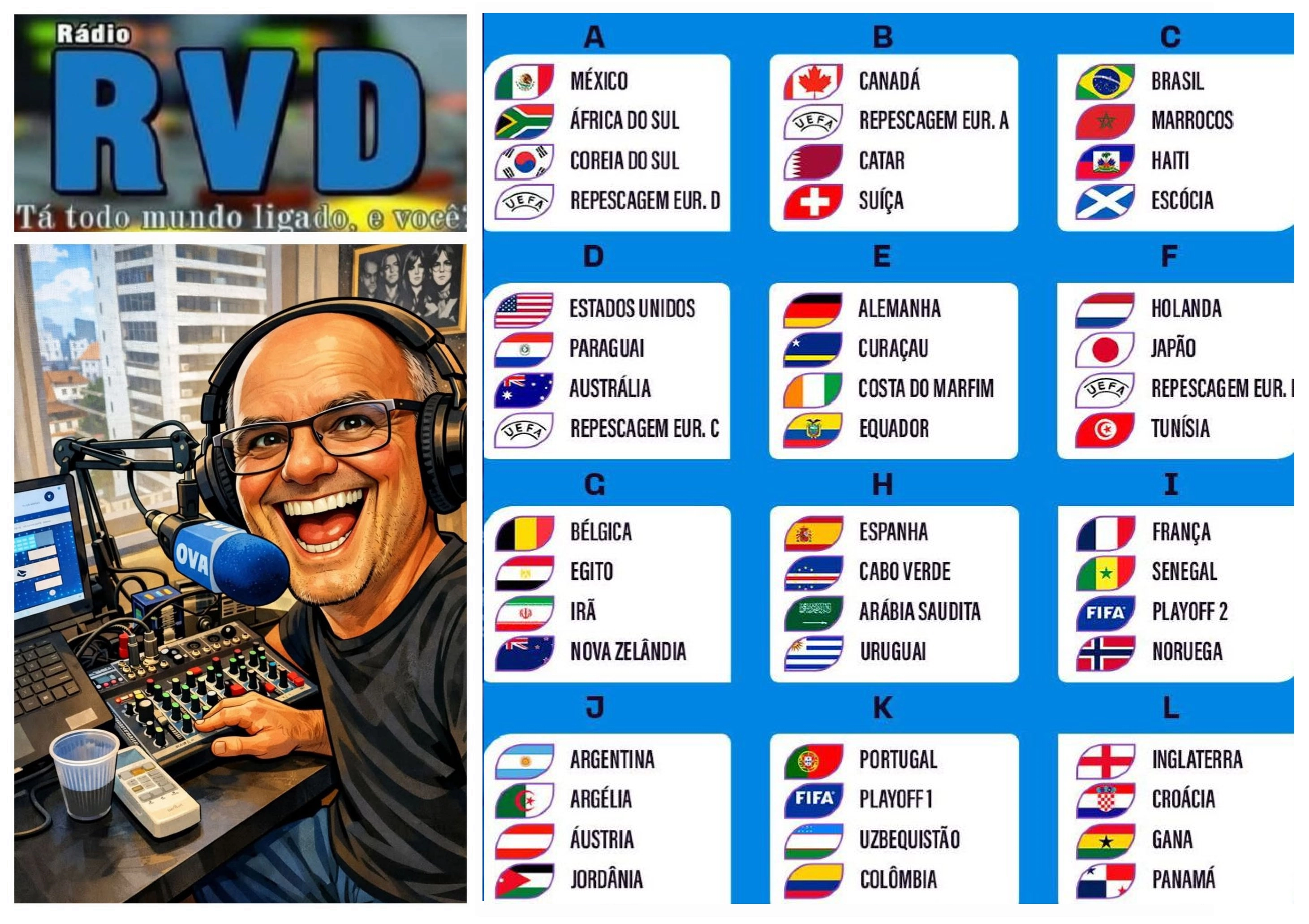RÁDIO RVD informa: Grupos da Copa do Mundo de Futebol 2026. O Brasil está no Grupo C ao lado de Marrocos, Haiti e Escócia. O torneio será disputado a partir do dia 11 de junho no México, Canadá e Estados Unidos